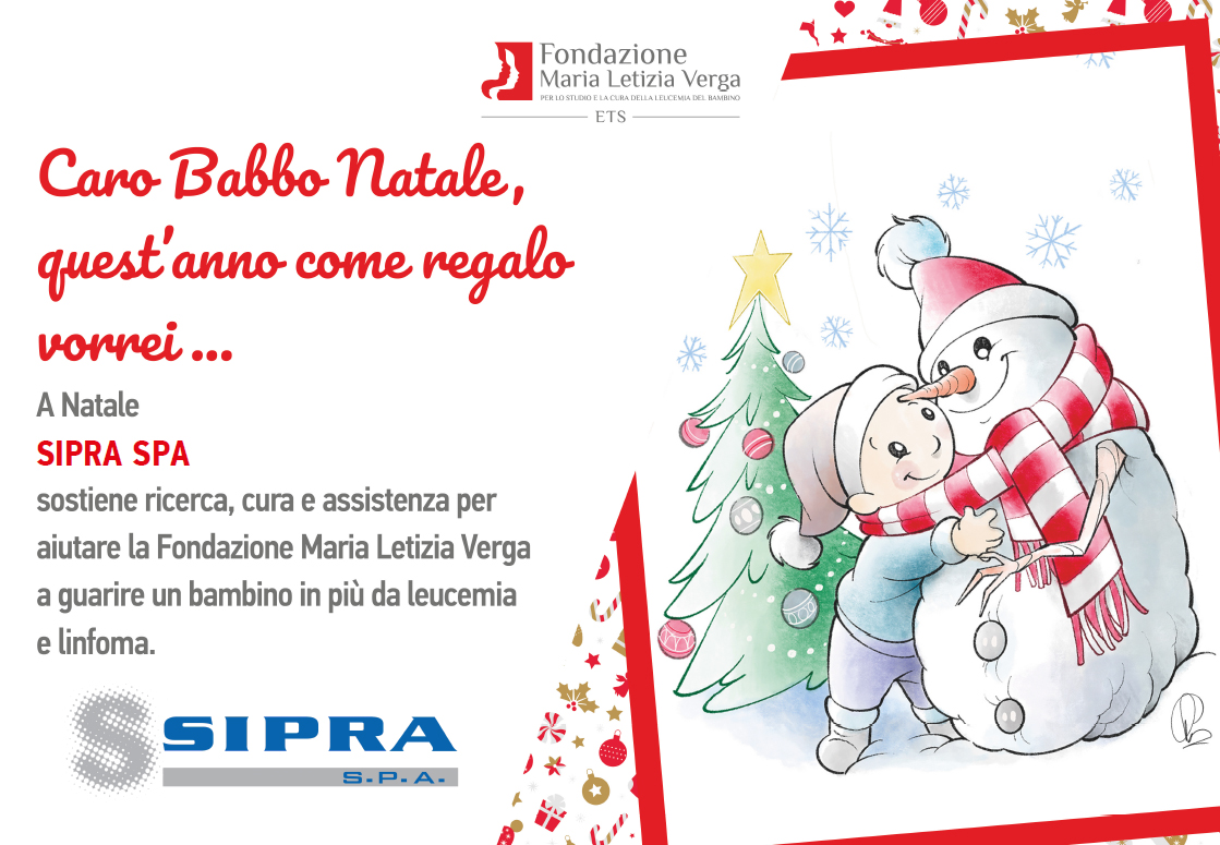 Quest’anno in occasione delle festività natalizie SIPRA SPA ha voluto che i suoi migliori auguri di Buone Feste non rappresentassero soltanto un segno di ringraziamento per un anno di collaborazione con Voi, ma anche una scelta di solidarietà ed un sostegno concreto a favore di chi ha più bisogno in questo momento.
